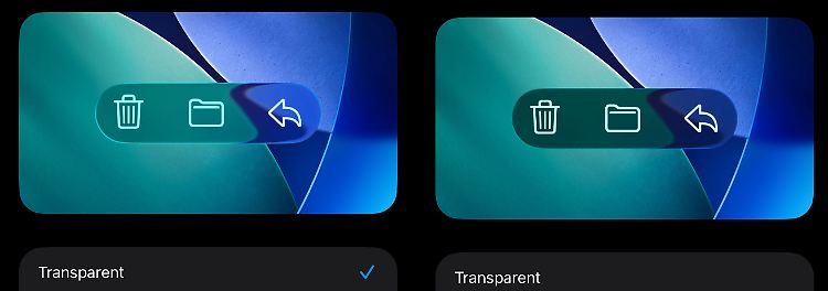 Die erste Option entspricht dem aktuellen Standard, wobei unter Objekten liegender Inhalt deutlich durchscheint. Eingefärbt erhöht die Deckkraft von Schaltflächen et cetera und erhöht den Kontrast.