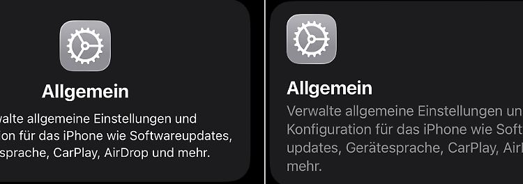 Ähnlich sieht es in der Einstellungen-App aus: Hier sind die Beschreibungen linksbündig statt zentriert. Überdies ist der Text blasser als die Überschrift.