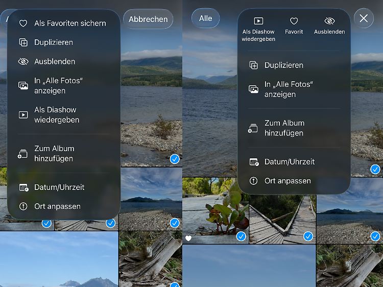 In der Fotos-App hat Apple einige kleine Änderungen vorgenommen. Die auffälligste davon sieht man vielleicht, wenn man einige Bilder auswählt und dann das Drei-Punkte-Menü aufruft: Als Diashow wiedergeben, Favorit und Ausblenden stehen jetzt gesondert über der Liste weiterer Optionen.