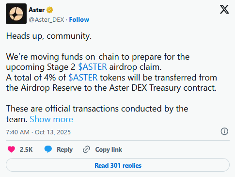 This Monday, the second phase of the Aster airdrop began , comprising 320 million ASTER coins , currently valued at approximately USD 336 million . This increases the total supply of 8 billion ASTER coins by 4% . Due to the airdrop, higher trading activity on the Perp DEX is also expected , which in turn could drive buybacks and burns during this time .
