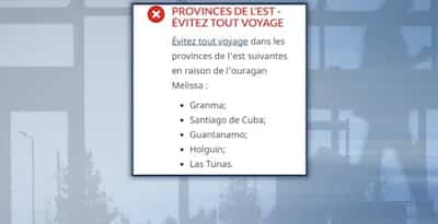 Regional warnings have been issued by the Government of Canada for travellers who want to go to eastern Cuban provinces such as Santiago, Holguin or Guantanamo.