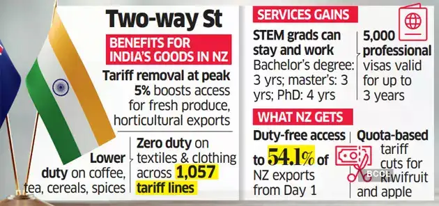 Historic Milestone: PM Modi“Concluded in just nine months, this historic milestone reflects a strong political will and shared ambition to deepen economic ties between our two countries. This FTA ensures: Enhanced market access, Deeper investment flows, Numerous opportunities for innovators, entrepreneurs, farmers, MSMEs, students and youth,” PM said in the post on X.Once signed, it will mark India’s seventh trade agreement since 2021. The pact will be signed in the next two-three months after the legal scrubbing of the text is concluded. Since New Zealand will need parliamentary approval, officials expect the FTA to come into effect in the next six-seven months. The third free-trade agreement this year, following a similar pact with the UK in July and another with Oman earlier this month, will give India more temporary employment visas, easier access for pharmaceuticals and medical devices. New Zealand gets zero tariff on wool, coal, wood to start with, lower duties on wine, avocados, blueberries and persimmons, and quota-based tariff cuts for kiwifruit and apple exports.“New Zealand is the first country to secure preferential access for apples in any Indian FTA, and the first kiwifruit exporter to secure tariff-free access for kiwifruit plus a 50% tariff reduction outside quota,” New Zealand government said in a statement. The pact will help Indian exporters, reeling under the impact of 50% tariffs imposed by the US on Indian goods, to diversify shipments in the Oceania region. India has already implemented a trade pact with Australia.Commerce and industry minister Piyush Goyal said the accord was a “win-win” for both countries. “We have been very sensitive to protect all the sectors, like farmers’ interest in rice, wheat, dairy, soya and various other farmer products, agricultural products, which have not been opened up with any access,” he said. “We have also been very conscious of ensuring that our MSMEs and our startup innovators get big opportunities in New Zealand.” Dairy and agriculture have been stumbling blocks in talks over the long-awaited India-US trade deal, with Washington seeking greater market access. Goyal said discussions for the US trade agreement are at an “advanced stage.”Demand for access to India’s dairy and agriculture markets was among the reasons that India had pulled out of the Regional Comprehensive Economic Partnership (RCEP) in 2019. “The current bilateral trade with New Zealand is small but the upside potential is huge,” Goyal said. Bilateral merchandise trade was $1.3 billion in FY25.Commerce secretary Rajesh Agrawal said that although only five formal rounds were held, both sides remained in continuous touch to close the negotiations. The $20 billion investment commitment is for foreign direct investment (FDI) only, especially in manufacturing and infrastructure. “In the last 25 years, New Zealand has invested only $75 million. This will open up collaboration with farmers and MSMEs, and include investments in education, sports. We are making a pitch for the Olympics and sports will be a good area of collaboration,” Goyal said.Key benefitsWith New Zealand eliminating tariffs that had peaked at 10%, Indian exporters of textiles and clothing will receive zero-duty access across 1,057 tariff lines. For wine, lamb and wool, India has made an offer that is similar to what it had given under the interim trade pact with Australia. India has cut tariffs on manuka honey by 75% over five years, making New Zealand the first country to secure preferential access for honey in any Indian FTA.“Ficci welcomes the conclusion of the India-New Zealand FTA, a significant step towards deepening economic engagement with the Indo-Pacific region. The agreement is expected to enhance bilateral trade, investment flows, and further collaboration, creating new growth opportunities for businesses in both countries,” said Ficci president Anant Goenka.Goods excludedUnder the agreement, products in exclusion list are dairy (milk, cream, whey, yoghurt, cheese etc.); animal products (other than sheep meat); vegetable products (onions, chana, peas, corn, almonds etc.); sugar; artificial honey; animal, vegetable or microbial fats and oils. The list also includes arms and ammunition; gems and jewellery; copper and articles (cathodes, cartridges, rods, bars, coils); aluminium and articles thereof (ingots, billets, wire bars).Quotas, import priceAs per the agreement, India has given greater market access in certain agricultural goods but with quotas, seasonal import windows and minimum import prices (MIPs) including manuka honey, apples, kiwi fruit and albumins, including milk albumin (used in medicines and making whey protein).Manuka honey, a niche New Zealand product, currently faces 66% duty. India has given duty concessions for up to 200 tonnes per annum with an MIP of $20 per kg. A 75% tariff reduction will be extended over a period of five years. Beyond this quota, the MIP will be increased to $30 per kg.On apples, the current applicable duty is 50%. India will give duty concessions for 32,500 tonnes of apples in the first year of the agreement. The quota will be increased to 45,000 tonnes in the sixth year at 25% duty with an MIP of $1.25 per kg. Beyond these quotas, 50% duty will be imposed. Similarly, for kiwi fruit, the current applicable duty is 33%. The tariff rate quota (TRQ) will be given on 6,250 tonnes (first year), which will be increased to 15,000 tonnes in the sixth year at zero duty with an MIP of $1.80 per kg. Beyond this quota, a 50% margin of preference will come into force with an MIP of $2.5 per kg.For albumins including milk albumin, the current duty is 22%. Under TRQ, the quota will be 1,000 metric tonnes (MT) in the first year of the agreement, which will be increased to 3,000 MT in the fifth year. Beyond that, the usual duty will come into force.Services, visaOfficials said that the pact delivers India’s “most ambitiou