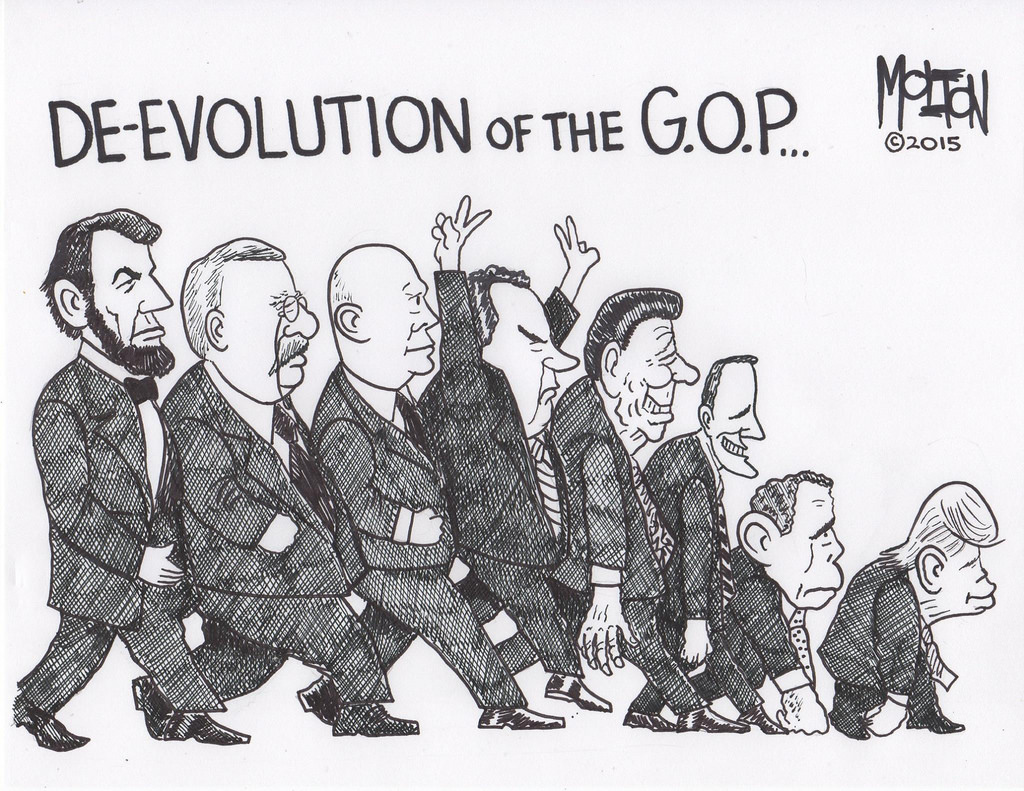 We are Americans who believe that the separation of church and state is, as historian Garry Wills wrote, the one unique, genius thing about our Constitution; that we need to learn the truth about our history to create a healthier future as a dynamic, creative and pluralistic society; that the gun lobby should not dictate how safe we are in our schools and churches; that women and people with different levels of melatonin in their skin have all the same rights that a white man has; that politics is the art of compromise, something you gave up on a long time ago because your ideas about governing finally collapsed into Reagan’s propaganda that government cannot work. (One thinks of cartoonist Randy Molton’s “De-evolution of the GOP.”)