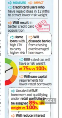 Mumbai: In a move aimed at encouraging disciplined credit behaviour and freeing up more capital for banks to lend, the Reserve Bank of India has proposed lowering risk weights on various loan categories and linking them to borrower risk profiles.Under its revised draft norms, the regulator has proposed capital requirements for credit cards, home loans, corporate loans, real estate exposures, and MSME lending.Among the key changes are easier norms for credit card users with timely repayment histories and tighter norms for big-ticket home loans.Credit card users who have repaid their dues in full over the past 12 months - termed 'transactors' - will be classified under the regulatory retail portfolio. This will reduce the applicable risk weight to 75% from 125%, lowering capital requirements for banks and incentivising better quality of acquisition by banks.
