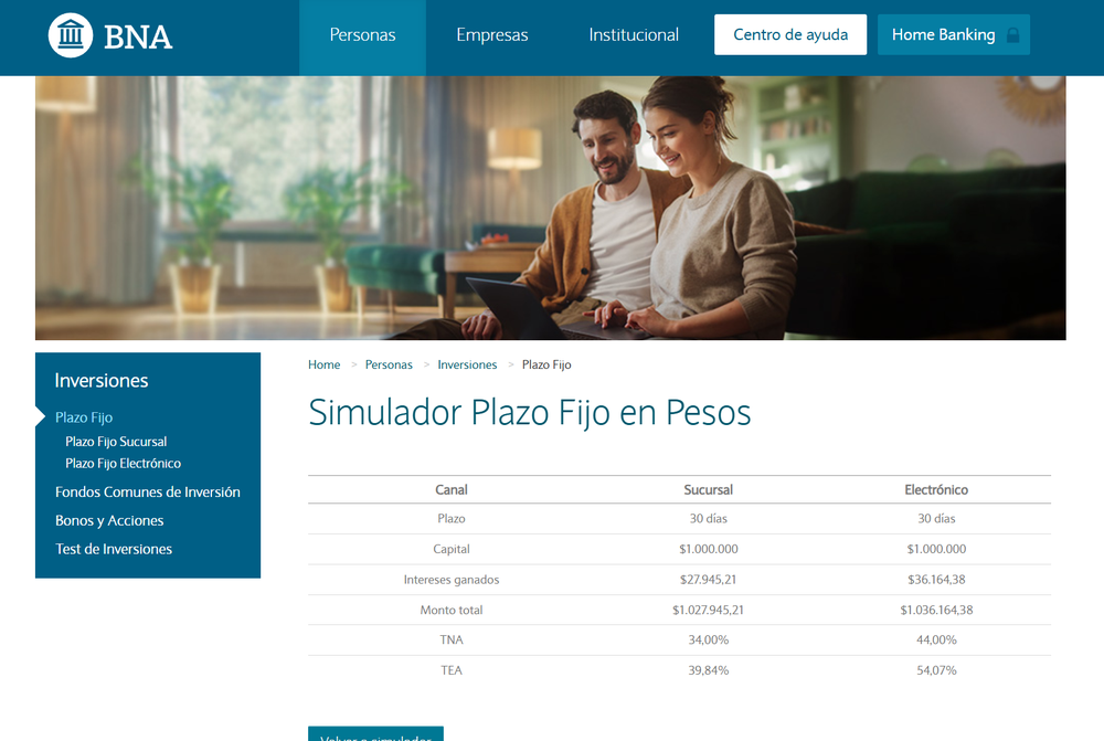 Chez Banco Nación , un dépôt à terme de 30 jours peut être effectué en personne ou en ligne, avec des taux d'intérêt variables selon le canal. D'après le simulateur officiel :