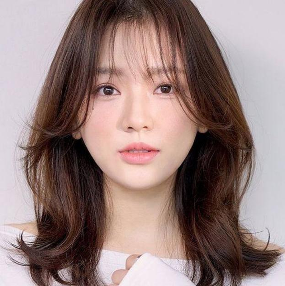 Средние волосы с корейской челкой придают лицу естественность и мягкость.