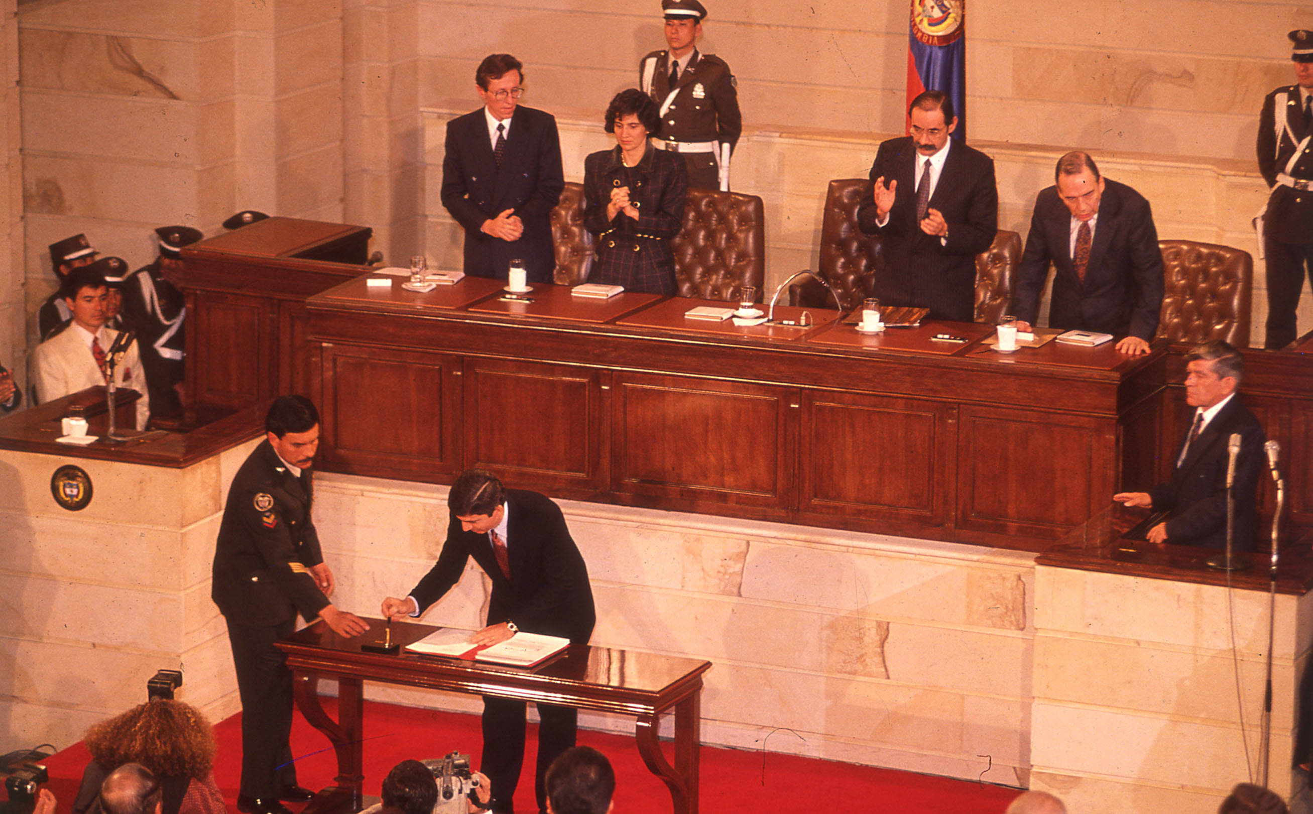 Eski Başkan César Gaviria 1991 Anayasasını imzalıyor. Fotoğraf: Iván Velandia. EL TIEMPO Arşivi