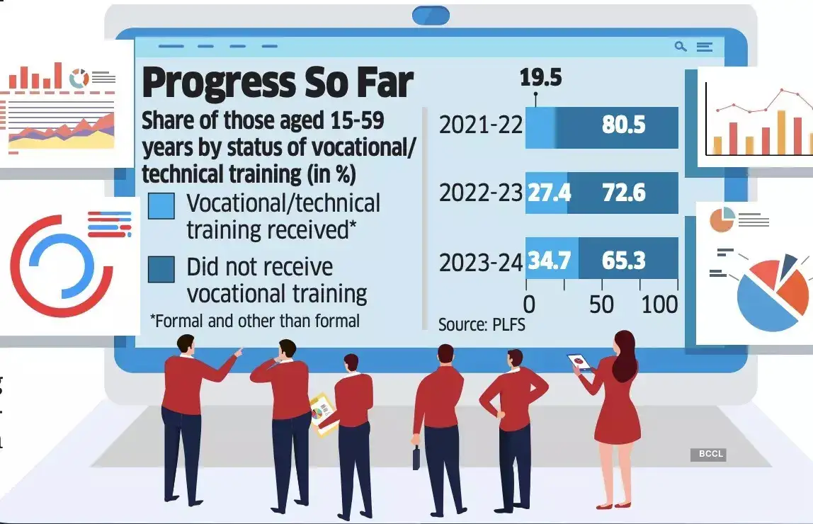 Bakanlık, yakın zamanda MoSPI'ye yaptığı sunumlardan birinde, "Eğitim alanı ve ekonomik faaliyet katılımları, beceri uyumsuzluğunun değerlendirilmesine yardımcı olacaktır" dedi. MSDE, beceri edinimiyle ilgili arz yönlü bilgilerin birden fazla anket aracılığıyla elde edilebildiğini, ancak talep yönlü bilgilerin çoğunlukla sektör beceri konseyleri tarafından periyodik olarak yapılan Beceri Açığı çalışmalarından elde edildiğini düşünüyor. Üst düzey bir hükümet yetkilisi, "PLFS, istihdam, işsizlik, eğitim ve mesleki eğitim gibi göstergeler için ana veri kaynağı olduğundan, kapsamının genişletilmesi, beceri ediniminin daha cazip hale getirilmesi için gerekli politika müdahalelerine yardımcı olacaktır" dedi. İstatistik Bakanlığı, Ocak 2025'ten itibaren PLFS metodolojisini yeniledi. Değişiklikler arasında, eğitimle ilgili yeni bir ekleme, mesleki/teknik eğitimin alındığı sertifika kuruluşunun niteliğine ilişkin bir sorudur. Veriler, mesleki/teknik eğitim alan 15-59 yaş arası bireylerin oranının 2022-23'teki %27,4'ten 2023-24'te %34,7'ye yükseldiğini gösteriyor. Bu arada, mesleki eğitimi olmayanların oranı aynı dönemde %72,6'dan %65,3'e düştü. MSDE ve NCAER tarafından ortaklaşa yürütülen yakın tarihli bir Ulusal Beceri Açığı Çalışması , IMF büyüme projeksiyonlarına dayanarak 2026-27'de yedi yüksek büyüme sektöründe 392 milyon iş öngörüyor. Rapora göre, Periyodik İşgücü Anketi'nin temel sınırlaması, yalnızca üç haneli Ulusal Meslek Sınıflaması (NCO) kodundaki iş rollerini kapsaması ve dokuma tezgahı ve el tezgahı gibi sektörlerdeki iş gücünü geride bırakmasıdır.