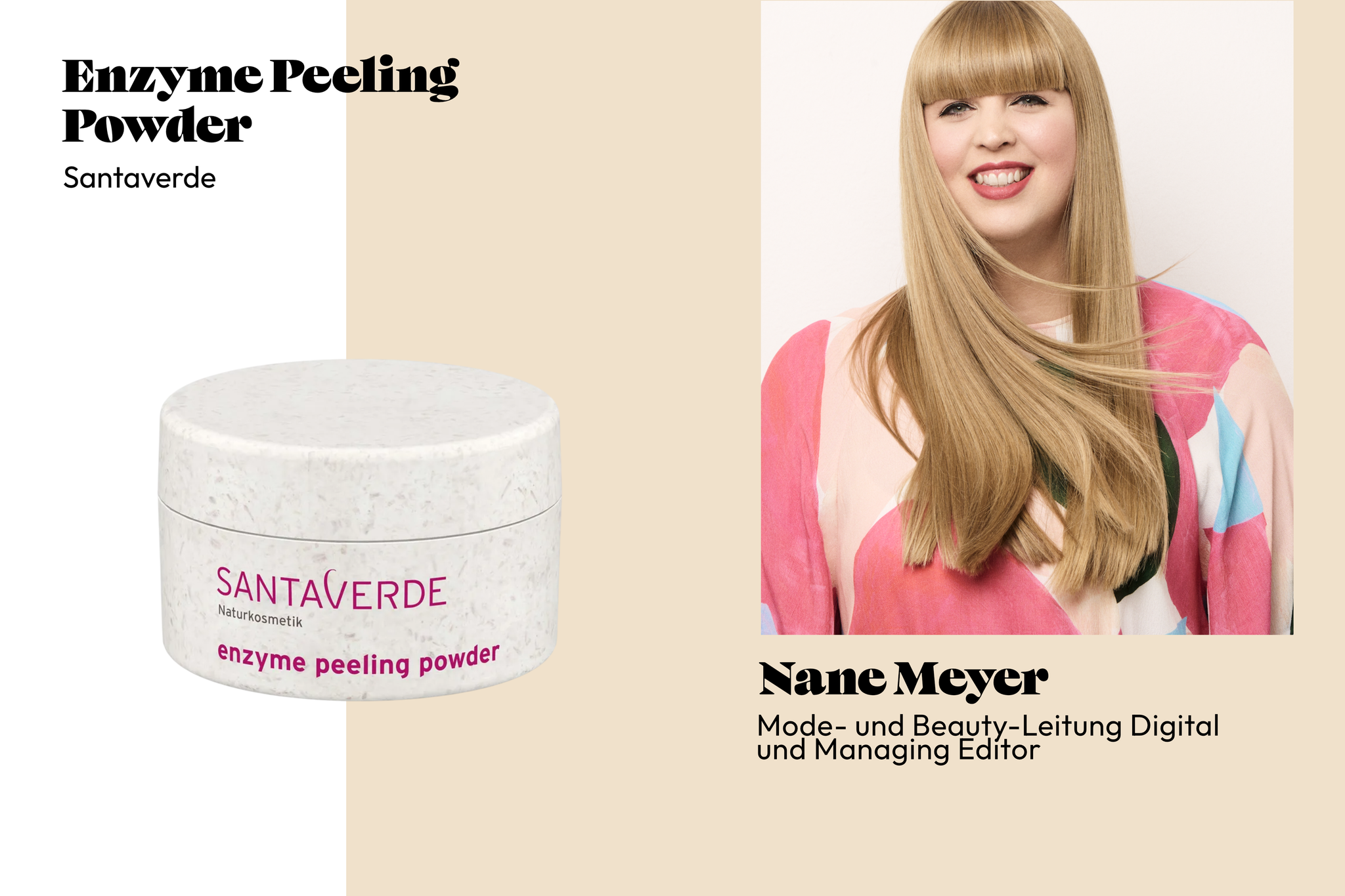 Product: Enzyme Peeling Powder by Santaverde Price: approx. €25 Promise: The Enzyme Peeling Powder is designed to gently exfoliate the skin, remove dead skin cells, and create a fresh, clear complexion. Effect: The powder is easy to mix with a little water and then apply to the skin once it has a nice creamy consistency. Leave it on for two to three minutes and then rinse with warm water. The skin immediately feels smooth, cleansed, and soft – in a good way. I use the peeling powder once or twice a week. It's my go-to autumn product because skin tends to be a little more sensitive as the weather gets colder. Natural fruit enzymes, including bromelain from pineapple, mineral clay, and gentle acids make the enzyme peeling suitable even for sensitive skin.