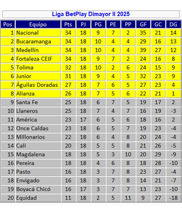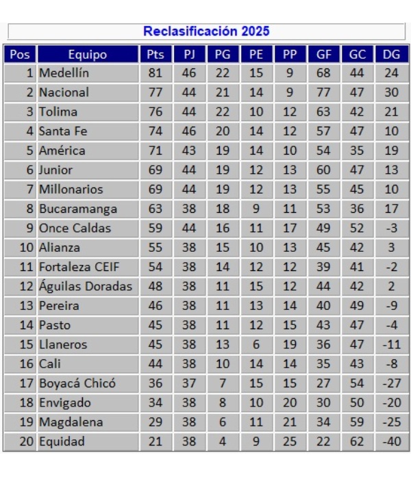 They also need Águilas Doradas to not add any more points, given their current goal difference of -4. The team managed by Spaniard Jonathan Risueño faces two tough opponents, both already qualified and vying for a top seed in the playoffs: Nacional, in Medellín, on matchday 19, and Tolima, in Rionegro, on matchday 20.
