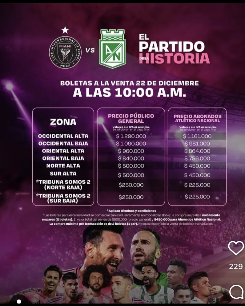 Los precios están divididos en dos categorías: público general y abonados de Atlético Nacional. Para los asistentes en general, las tarifas van desde $250.000 en la Tribuna Somos 2 (Norte y Sur Baja, con venta únicamente en pares) hasta $1.290.000 en Occidental Alta. También estarán disponibles Occidental Baja ($1.090.000), Oriental Alta ($960.000), Oriental Baja ($840.000), Norte Alta ($500.000) y Sur Alta ($500.000).