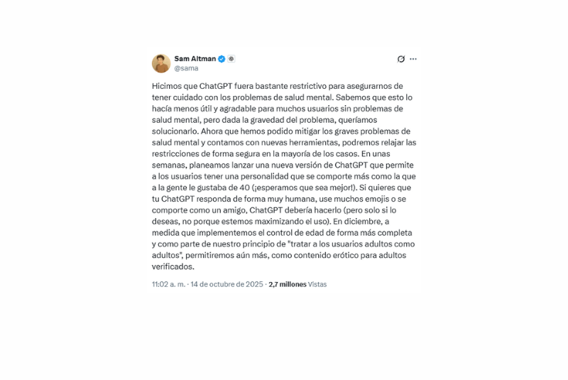 Новое обновление будет содержать эротический контент. Альтман заявил, что к декабрю, по мере более полного внедрения возрастного контроля и в соответствии с принципом «обращения со взрослыми пользователями как со взрослыми », будет разрешено больше обновлений.