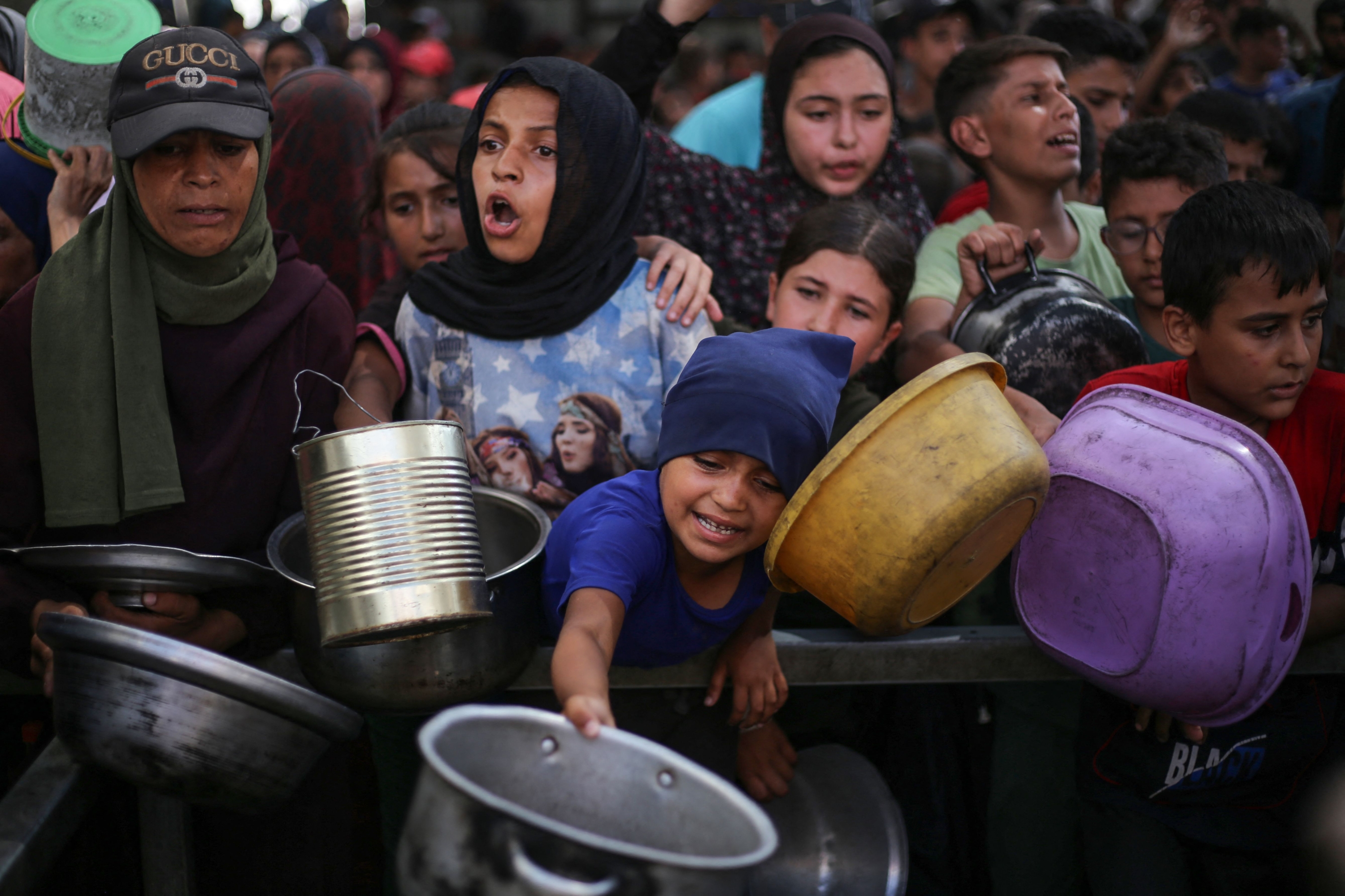 Палестинцы собираются, чтобы получить продуктовые пайки в бесплатной столовой в Нусейрате. Фото: Эйад Баба / AFP